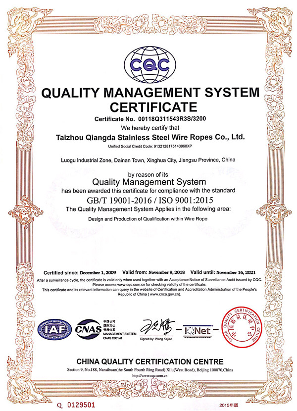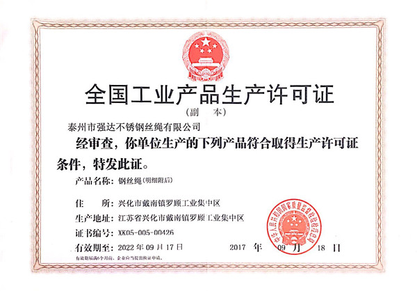 泰州市強(qiáng)達(dá)不銹鋼絲繩有限公司位于江蘇興化市戴南經(jīng)濟(jì)開(kāi)發(fā)區(qū),公司致力于不銹鋼絲繩產(chǎn)品生產(chǎn),立志成為“國(guó)內(nèi)技術(shù)標(biāo)桿型吊索具生產(chǎn)企業(yè)”。以此戰(zhàn)略思想指導(dǎo),公司堅(jiān)決貫徹“質(zhì)量贏市場(chǎng),管理增效益,誠(chéng)信贏天下”的質(zhì)量方針。以完善的服務(wù)在國(guó)內(nèi)不銹鋼絲繩市場(chǎng)樹(shù)立良好的品牌形象。公司榮獲“江蘇省質(zhì)量信得過(guò)企業(yè)。 靈活的管理機(jī)制,經(jīng)驗(yàn)豐富的