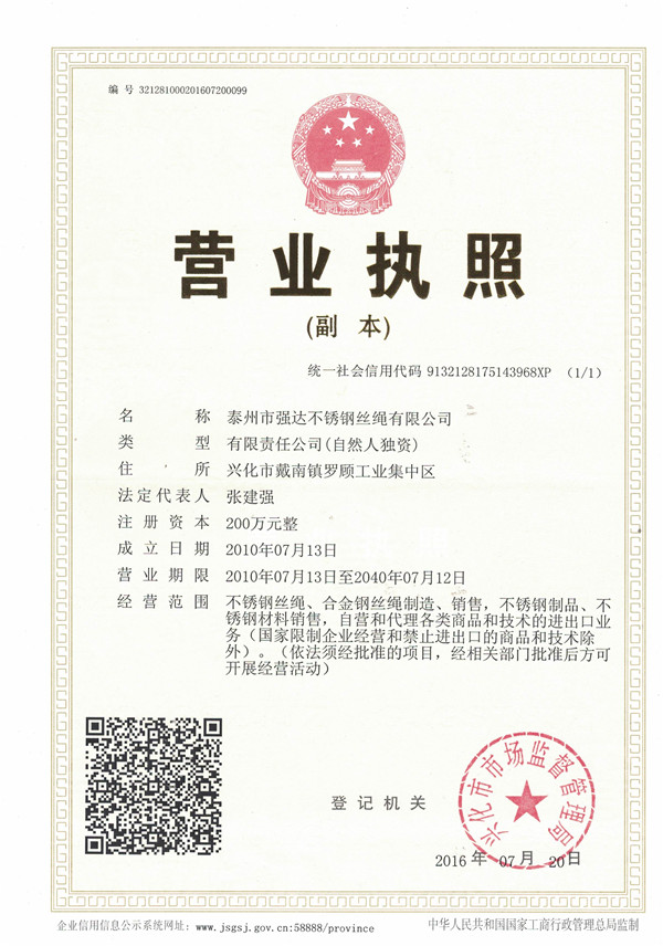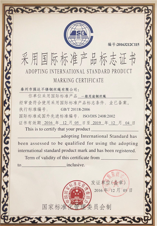 泰州市強(qiáng)達(dá)不銹鋼絲繩有限公司位于江蘇興化市戴南經(jīng)濟(jì)開(kāi)發(fā)區(qū),公司致力于不銹鋼絲繩產(chǎn)品生產(chǎn),立志成為“國(guó)內(nèi)技術(shù)標(biāo)桿型吊索具生產(chǎn)企業(yè)”。以此戰(zhàn)略思想指導(dǎo),公司堅(jiān)決貫徹“質(zhì)量贏市場(chǎng),管理增效益,誠(chéng)信贏天下”的質(zhì)量方針。以完善的服務(wù)在國(guó)內(nèi)不銹鋼絲繩市場(chǎng)樹(shù)立良好的品牌形象。公司榮獲“江蘇省質(zhì)量信得過(guò)企業(yè)。 靈活的管理機(jī)制,經(jīng)驗(yàn)豐富的